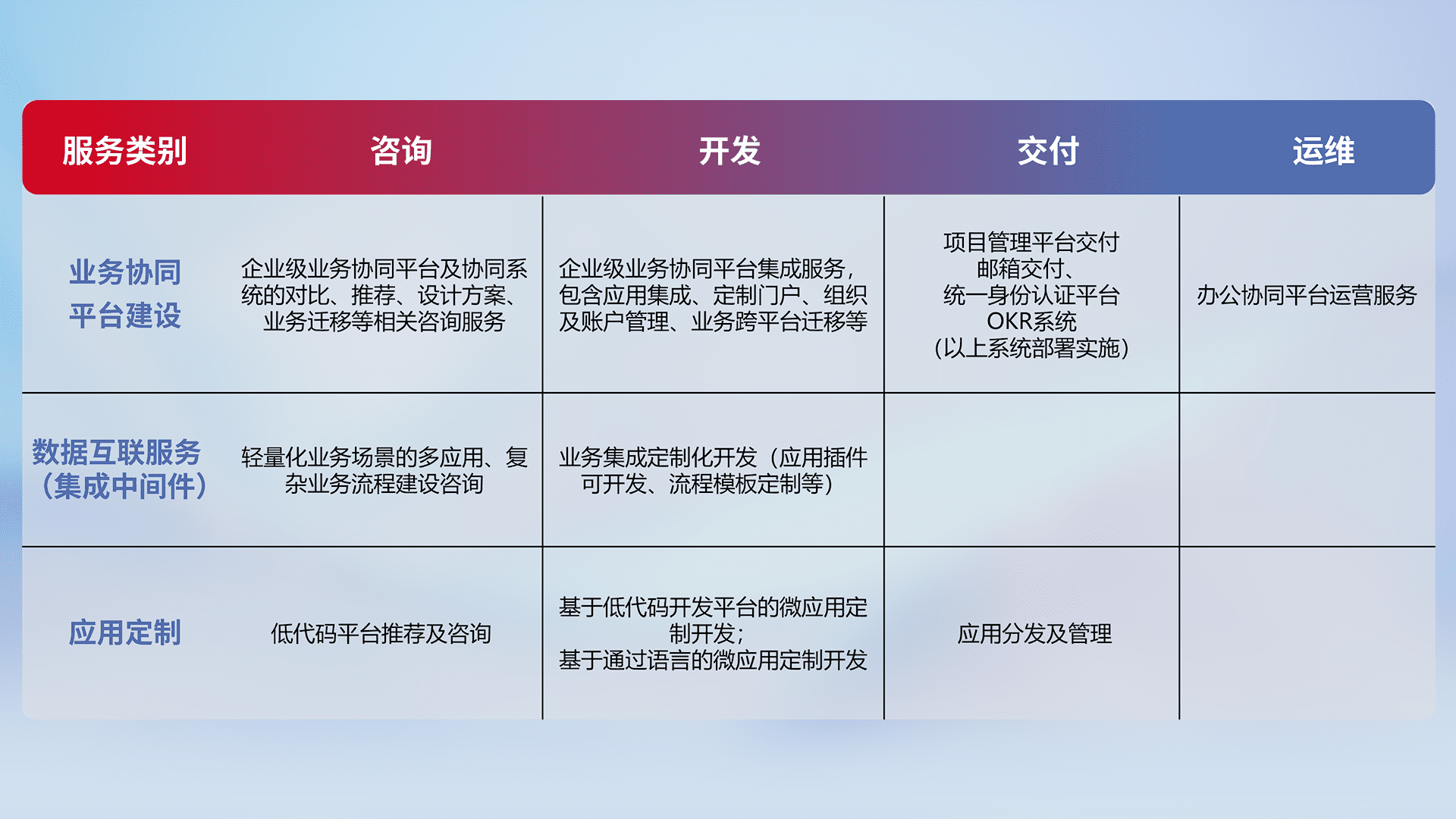 针对钉钉、、、、企微、、IDaas等平台级产品提供产品的规划、、、方案、、交付、、定制化开发等服务,,,,实现如统一协同办公、、、智能客户服务、、、、混合会议管理、、、、智能数据查询、、等业务场景,,,实现数字化转型。。