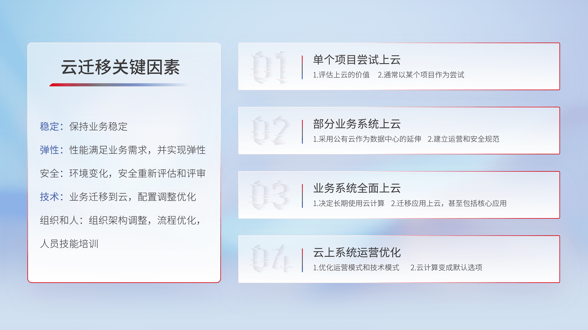 结合实际业务,,从规划设计、、云平台选型、、云原生改造、、、数据迁移、、、集成交付,,,迁移全过程为客户识别最佳上云路径,,,做好风险识别管理,,,,设计网络架构、、身份权限、、、安全审计合规、、操作审计、、日志审计、、、监控告警策略、、多站点容灾设计等,,,对云上基础设施进行整体规划,,,提升IT治理水平,,,,以满足弹性、、、、高可用、、、、高性能的需求。。