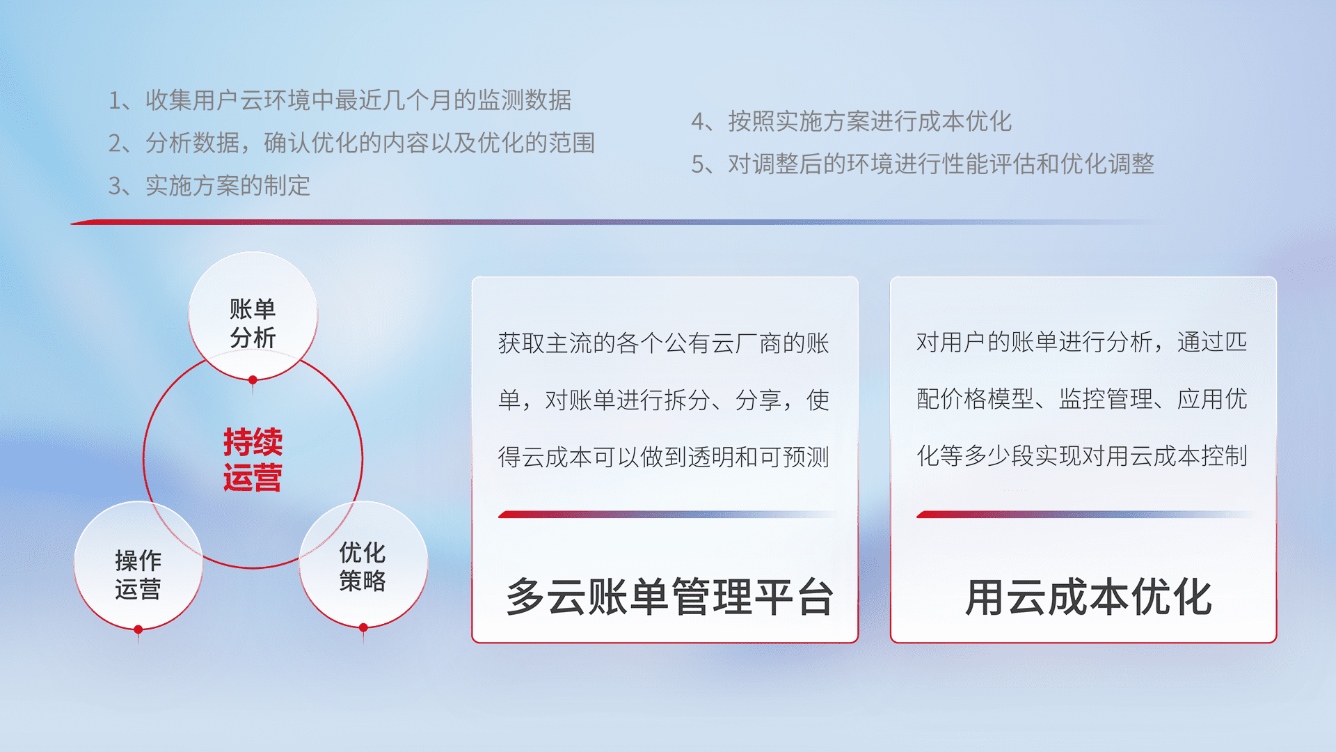 通过多云纳管,,以统一的资源数据模型把客户的云资源进行抽象和封装,,,,进而实现对多云资源的统一操作,,,保障云资源管理的可靠性、、、、稳定性与可用性。。。。量身定制化运维内容,,配置、、、、开发运维、、补丁管理、、、、备份、、、监控、、、认证和访问管理、、审计和日常巡检等,,,保障在用云过程中的可靠度,,,稳定度以及高可用率。。